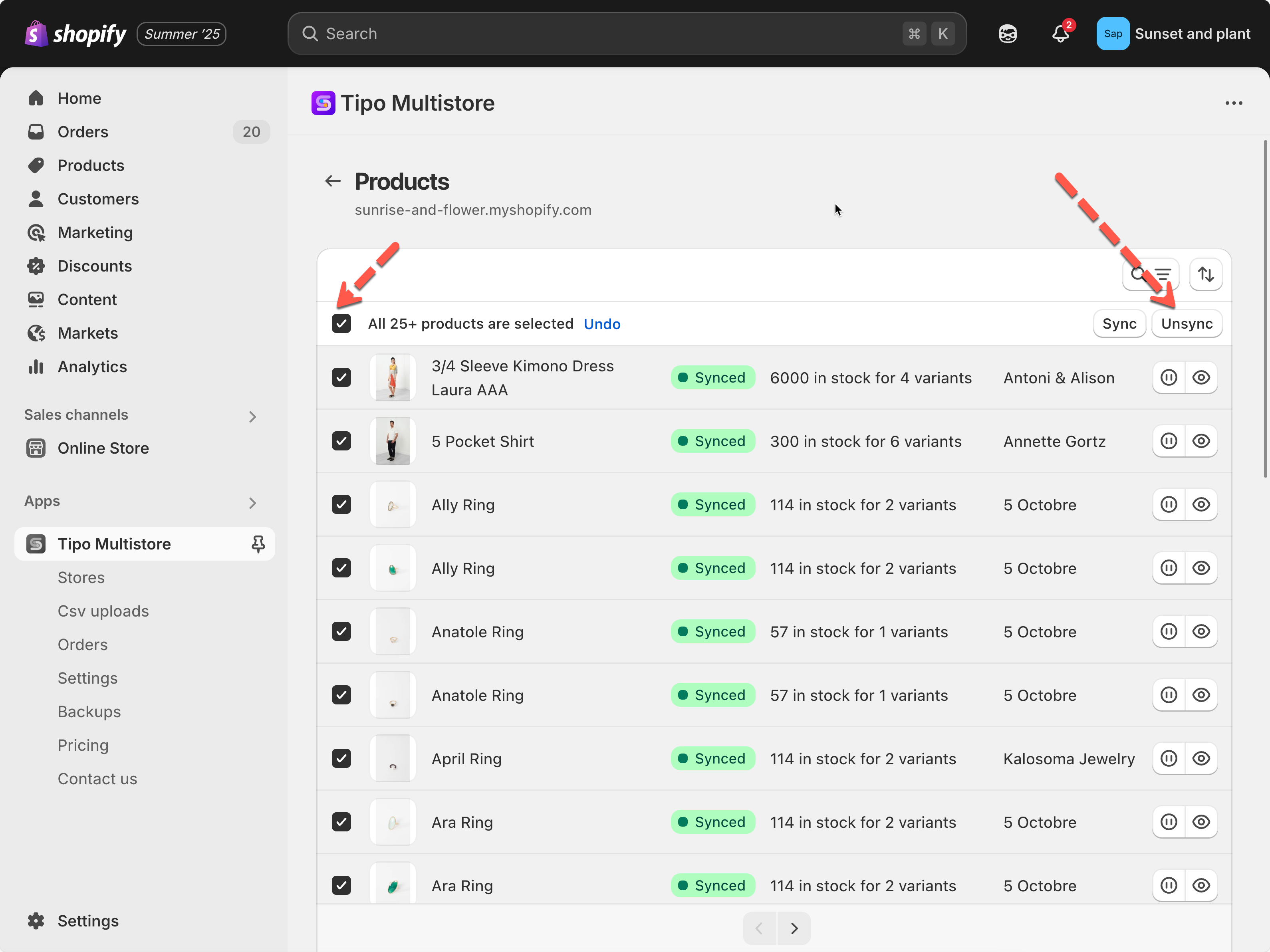 3. For bulk action: select the products you want to sync. Select Select all 25+ products if you want to select all products in the list > click Unsync button on the right side